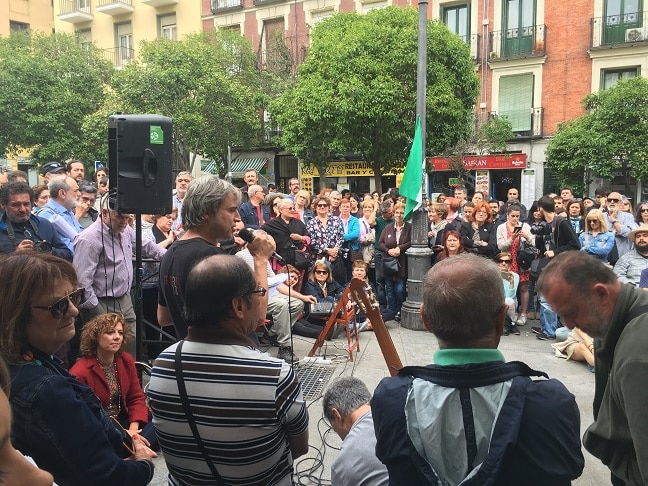 La España ingobernable, de Alberto San Juan, no se estrenaba hasta este jueves 26 de mayo en la Sala Mirador, dentro del Festival SURGE Madrid. Sin embargo, hoy miércoles, San Juan y su acompañante a la guitarra, Fernando Egozcue, han querido preestrenarla en la calle, en la plaza de Lavapiés. No ha sido al azar. Es la plaza donde se encuentran ahora mismo Diego Cañamero y otros 17 sindicalistas del Sindicato Andaluz de Trabajadores (SAT), que llevan diez días en huelga de hambre para protestar por la encarcelación de Andrés Bódalo.