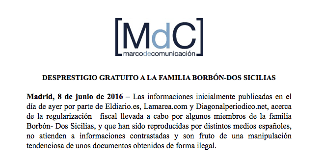 Según los Borbón-Dos Sicilias, las noticias publicadas «no atienden a informaciones contrastadas». eldiario.es se ha puesto en contacto en representación de los tres medios con la agencia de comunicación que envía este comunicado para preguntar exactamente qué datos estaban sin contrastar. Según una portavoz de esa agencia, las noticias se han realizado sin haber llamado a los afectados para recabar su versión. Sin embargo, tanto eldiario.es como La Marea y Diagonal tienen en su poder las grabaciones de las diferentes llamadas a los afectados, realizadas una semana antes de la publicación de esta exclusiva.