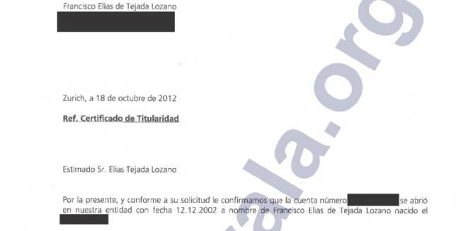 Según un certificado de titularidad enviado por UBS Zurich a Elías de Tejada en octubre de 2012, éste abrió una cuenta en esta entidad financiera suiza el 12 de diciembre de 2002 que ha tenido abierta al menos hasta 2011. Poco después de la apertura de esta cuenta, el 17 de enero de 2003, Elías de Tejada fue designado oficialmente embajador en Costa de Marfil, un puesto que mantuvo hasta abril de 2007 junto con el de embajador de Burkina Faso y Níger.