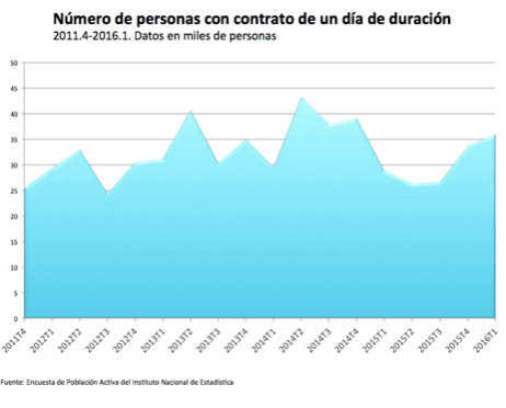 9) En el primer trimestre de 2016 se firmaron 35.800 contratos de un día de duración. En algunos trimestres recientes se firmaron muchos más, como el segundo de 2014, que se llegaron a firmar 43.200. Antes de la llegada de Rajoy al gobierno, estos contratos nunca habían superado los 26.000 en un trimestre.
