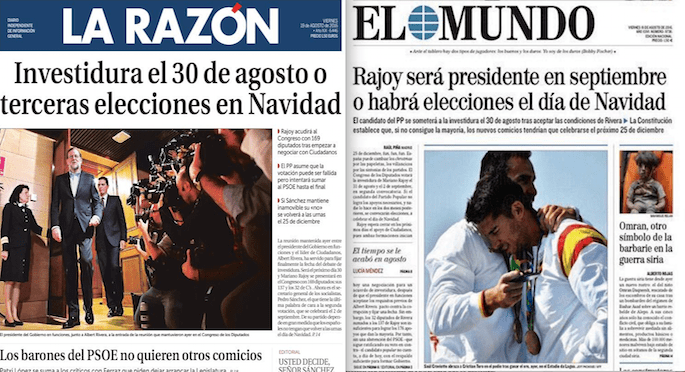El Mundo y La Razón llevan este viernes a toda portada dos sentencias que no dejan lugar a la interpretación. El diario dirigido por Pedro García Cuartango dice: “Rajoy será presidente en septiembre o habrá elecciones el día de Navidad”. Por su parte, el periódico que dirige Francisco Marhuenda afirma: “Investidura el 30 de agosto o terceras elecciones en Navidad”. Ambas portadas son falsas, una mentira sin lugar posible a la interpretación.