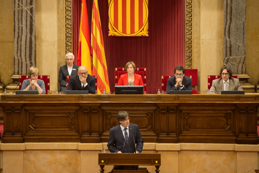 “O referéndum o referéndum”. Ha sido el titular más repetido sobre las palabras del president de la Generalitat de Catalunya, Carles Puigdemont, quien desplegó este martes, durante la moción de confianza, un discurso de formas contundentes y en todas direcciones en el que anunció un referéndum de independencia para la segunda quincena de septiembre del próximo año. Será, por tanto, justo después de la Diada de 2017. La concreción ha ido dirigida al gobierno de España pero también a dos actores políticos dentro del territorio: CSQP, que ha hecho bandera desde el principio de un referéndum pactado con el gobierno central, y la CUP, de quien ha cogido también la propuesta de la consulta y a quienes ha emplazado a dar un apoyo continuado al Govern hasta la independencia.