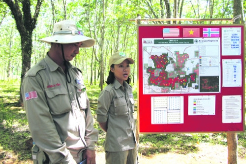 Duong Duc Tam es uno de los líderes de equipo de Project RENEW. «La población local nos informó que sospechaba que esta zona estaba muy contaminada. Entre 1967 y 1972, la aldea que hay aquí cerca [Thon Doc Kinh] se usaba como almacén de armas del Ejército norvietnamita, pero la fuerza aérea americana lo detectó, y por eso fue bombardeada con todo tipo de munición», explica Tam. «Es una zona muy peligrosa. En un año se han encontrado aquí más de 600 bombas, pero aun así la gente ha cultivado todo tipo de árboles comerciales. Tienen que comer», lamenta mientras señala un mapa lleno de puntos rojos. Tam habla con la vista fija en sus compañeros, que se mueven despacio a unos 20 metros, mirando al suelo, precedidos por el balanceo de los detectores de metales. De repente, pasa una mujer en motocicleta, con dos cubos llenos de resina de caucho. «Bip, bip».