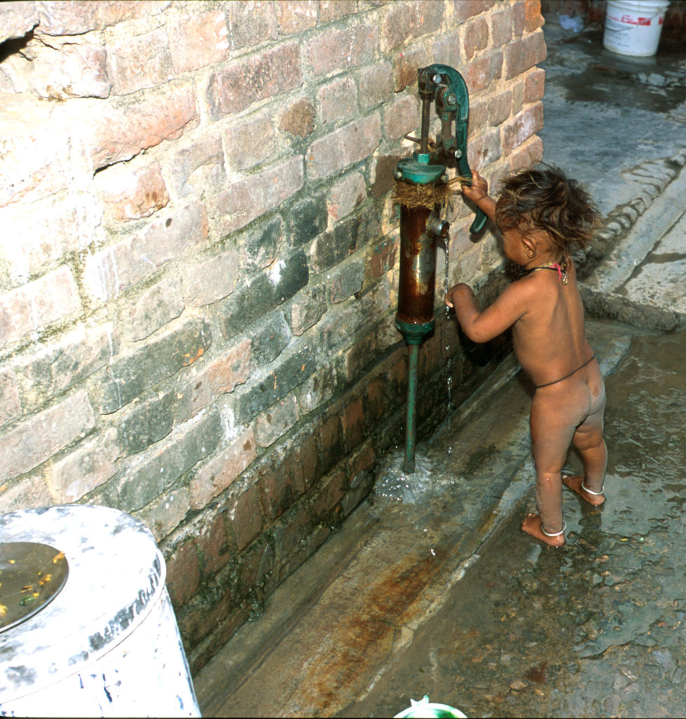 Un niño abre un grifo de agua en un barrio de Delhi (India).