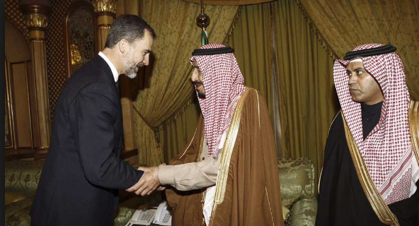 En uno de sus últimos viajes antes de abdicar, el rey llegó el 15 de mayo de 2014 al aeropuerto de Yeda, en Arabia Saudí. Iniciaba una visita de apenas tres días a esta dictadura del Golfo Pérsico, el quinto Estado en una gira primaveral por los países del área petrolífera más importante del mundo (la península Arábiga es el segundo suministrador de crudo a España). Le acompañaba su séquito habitual, como en las anteriores visitas a Emiratos Árabes Unidos, Kuwait, Omán y Bahréin: los entonces ministros de Industria y de Fomento, José Manuel Soria y Ana Pastor, y el de Defensa, Pedro Morenés, así como representantes de las grandes multinacionales españolas.
