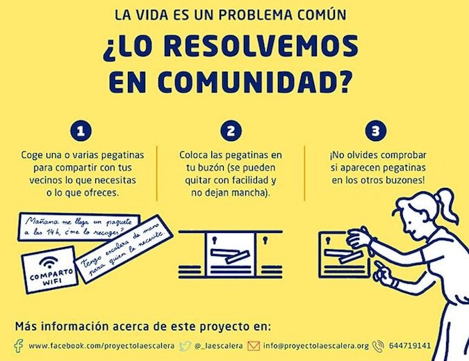 Esa circunstancia sirvió de inspiración para dar forma a una idea que, poco tiempo después de nacer, ya está dando mucho que hablar: el Proyecto la Escalera. Una iniciativa sencilla con un objetivo ambicioso: crear redes de apoyo mutuo entre vecinos, fomentar la solidaridad y crear comunidades más unidas y transversales. A través de un sencillo kit que se puede descargar e imprimir a través de su web, cualquier ciudadano puede colocar en su portal un cartel y cuatro sencillas pegatinas: ‘te riego las plantas’, ‘comparto wifi’, ‘te subo la compra’ y ‘te invito a un café’. Además, se facilitan plantillas en blanco para que cada cual escriba lo que quiera que esté dispuesto a ofrecer.
