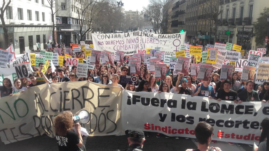 MADRID // Es la tercera huelga de estudiantes de la enseñanza pública este curso, la segunda convocada por CEAPA y la primera de sindicatos de profesorado. La Plataforma Estatal por la Escuela Pública, integrada por sindicatos, profesores, estudiantes y padres, han convocado este jueves una huelga general en todos los niveles de enseñanza y manifestaciones en toda España para exigir más inversión educativa y la derogación de la LOMCE. Los convocantes han llamado a «vaciar las aulas» desde Infantil hasta la Universidad, y para exigir que el pacto educativo sea social «y no sólo político».