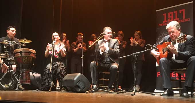 1917 es la cerveza que este miércoles vendían en la entrada del Teatro Duque de Sevilla. ¡Es la fecha de la revolución rusa!, dirán los más avezados. El tiempo dice que es el año del que han pasado cien años. Y lo que anoche, sobre el escenario de ese mismo teatro, dijeron el cante de Manuel Romero y la guitarra de Eduardo Rebollar es que 1917 es flamenco. La cooperativa Atrapasueños ha editado un disco homenaje a la fecha centenaria donde igual suena un poema de Brecht por tango, que unos versos de Shelley por peteneras que una letra de Moreno Galván por soleá. “Las efemérides sirven para que uno se reconozca y entienda el momento histórico que vive. Es muy complicado meter a Mayakosvki por marianas, es muy complicado meter a Lenin por trillas. Esto es 1917, que cada uno haga lo que quiera”, avisa Joaquín Recio, alma de la cooperativa, momentos antes de dar paso al concierto.