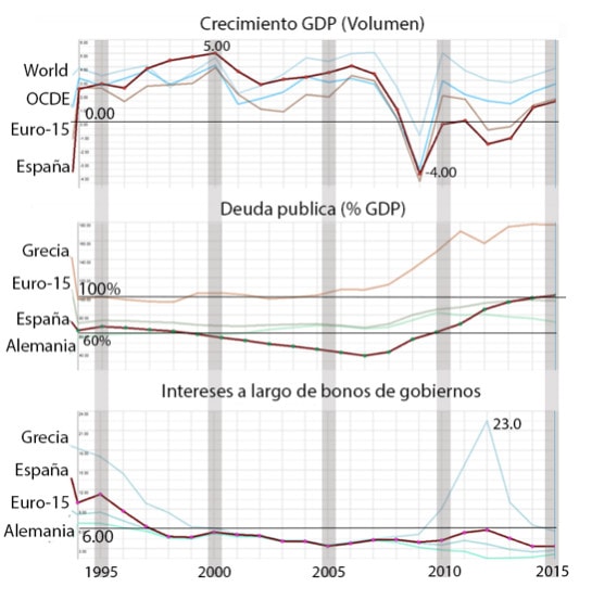 El crecimiento perpetuo necesario para mantener el sistema capitalista (solo bajo expectativas de crecimiento se produce la inversión) viene observándose languidecer pese a haber sido camuflado por el aumento de la deuda especulativa a costa del crecimiento futuro. Ese aumento de deuda especulativa ha provocado una sensación de viabilidad del capitalismo mientras se estaba hipotecando el futuro de los países, ya que fueron los Estados los encargados de absorber la deuda creada en el periodo de desregulación financiera.