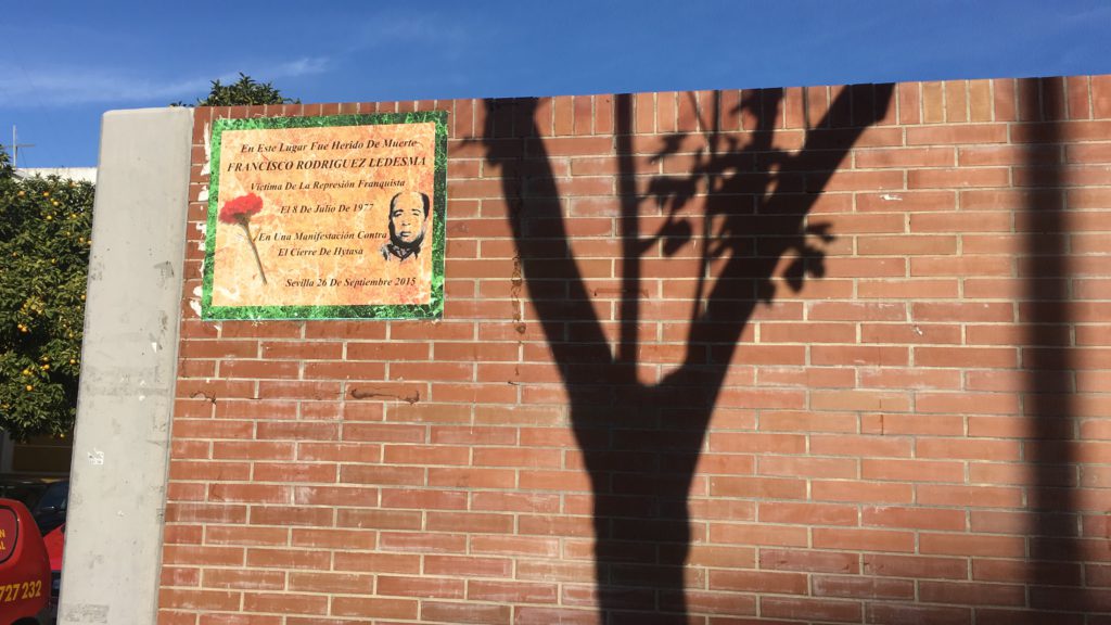 La esquina donde sucedieron los hechos ve pasar los días como si nada. «Alquilo piso por 450 euros». «Vendo piso por 82.000 euros», anuncian varios papeles pegados a una señal de ceda el paso. Son otros tiempos. Hay otros nombres. Avenida Hytasa con calle Diamantino García, entonces Comandante Castejón. El tiro, tan fallido en la Transición cuando iba dirigido al aire, alcanzó esta vez a Francisco Rodríguez Ledesma, un albañil que se había acercado a la manifestación contra el cierre de la fábrica textil del mismo nombre que la avenida y que tantos uniformes para el Ejército franquista había confeccionado. Queipo de Llano había puesto la primera piedra. El dictador la había visitado. Hoy, frente a aquella esquina hay un edificio de la Junta de Andalucía. Al lado, Casa Arcadio pone desayunos como si no hubiera un mañana. Un cartel indica una peluquería de caballeros y niños a escasos metros. Y en la esquina, justo en la esquina, se levanta una escuela infantil con ladrillos vistos.