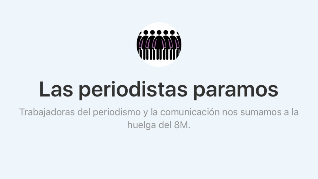 «Mujeres periodistas de decenas de medios y agencias de comunicación, gabinetes de prensa y, en general, trabajadoras de medios y empresas periodísticas apoyamos la huelga general feminista convocada para este 8 de marzo». Así comienza un manifiesto lanzado este jueves que pide a todas las mujeres que trabajan en el sector que se sumen a la movilización en la medida de sus posibilidades y circunstancias.