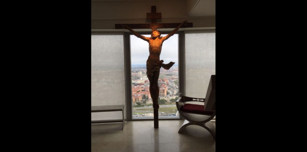 Es viernes de la cuarta semana de Cuaresma y en la misa de la planta 33 el sacerdote lee con voz grave un pasaje del Evangelio según San Juan. “(…) Entonces intentaban agarrarlo; pero nadie le pudo echar mano, porque todavía no había llegado su hora. Palabra del Señor”. Los feligreses allí presentes recitan rigurosamente las réplicas señaladas por las Santas Escrituras para cada lectura, más allá de los tradicionales y mundanos ‘lo tenemos levantado hacia el señor’, ‘es justo y necesario’, ‘y con tu espíritu’. El capellán, el venezolano Manuel Sánchez, pronuncia varias frases en latín.