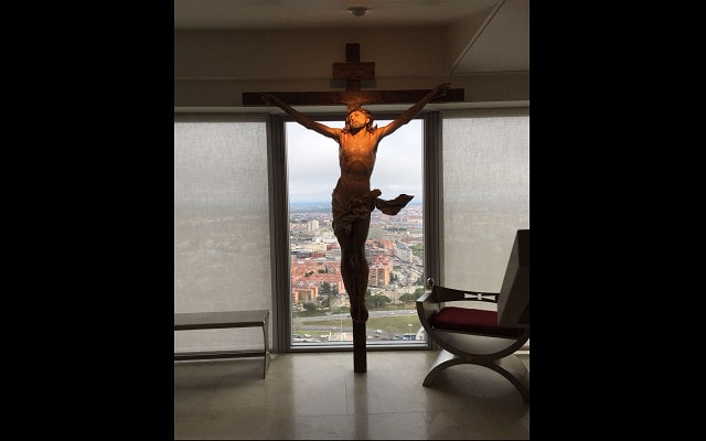 Son las 8.30 de la mañana y un grupo de 12 personas –nueve hombres, tres mujeres– con look ejecutivo acompaña la liturgia. Las bancas son de acero inoxidable y están forradas en cuero. La estancia está revestida de madera. La virgen del altar luce una discreta bandera de España y el cristo, tallado con sumo realismo, da la espalda a la imponente Sierra Norte de Madrid. Termina la ceremonia y la mayoría de los 12 feligreses sale rápidamente de la sobria y refinada instancia. Dos asistentes se acercan teléfono en mano al hombre corpulento y de aire aristocrático que permanece arrodillado en primera fila. Le susurran algo al oído. Los aleja sin siquiera mirarlos con un ademán casi imperceptible y prosigue con sus oraciones.