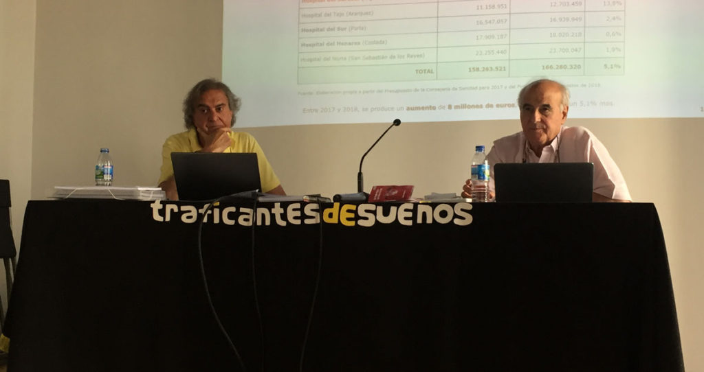 “En este trabajo nos planteábamos si lo que se aporta en los presupuestos es suficiente para financiar la sanidad. También nos preguntábamos cómo se distribuyen esos recursos, para saber si se está apoyando más a la privada o a la pública. Y, finalmente, el estudio de la deuda pública”, enumeró Juan Luís Ruiz-Jiménez, doctor jubilado de la sanidad pública y actual activista en defensa de la sanidad. “Lo importante no es si asignamos más recursos o no, sino si son suficientes. Y podemos decir que no son suficientes”, aseguró el economista Vicente Losada durante la presentación, en la librería Traficantes de Sueños.