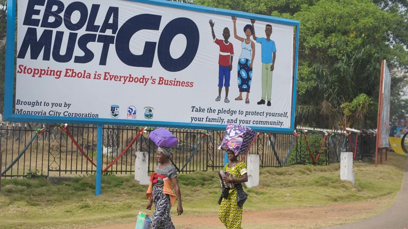 Dos mujeres caminan frente a una valla publicitaria, que dice: "El ébola debe desaparecer. Detener el Ébola es un asunto de todos", en Monrovia, Liberia. Foto: UNMIL/Emmanuel Tobey / Licencia CC BY-ND 2.0