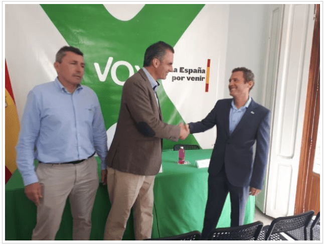 Javier Ortega Smith, secretario general de VOX, saluda a Luis Armada en presencia de Pascual Salvador.