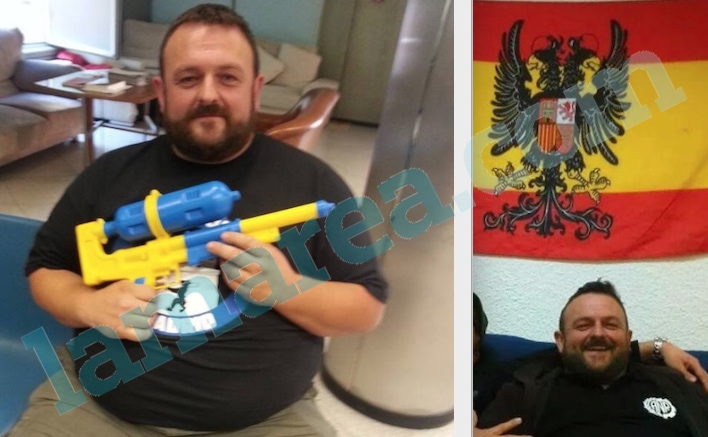 En la foto superior se le puede ver en una reunión fascista en la que uno de sus miembros sujeta una bandera de “Españoles autónomos” y diferentes personas realizan el saludo romano. En otra de las fotos, el número 24 viste un polo con las iniciales ANR, correspondientes a Acción Nacional Revolucionaria, un grupúsculo neonazi conocido por la organización de actos para ensalzar la División Azul, la unidad de soldados españoles que lucharon en favor de Hitler en la II Guerra Mundial.