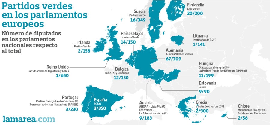 El mejor dato lo ha conseguido Liga Verde, de Finlandia, quienes en las elecciones del pasado abril sacaron 20 escaños y un 11,5% de los votos, la quinta fuerza política. En Grecia, por ejemplo, Los Verdes Ecologista solo tienen dos de los 300 escaños, y fueron en coalición con SYRIZA, el actual partido en el poder. En España está Equo, que en las últimas elecciones generales obtuvo tres diputados tras integrarse en la candidatura de Unidas Podemos. En cambio, donde no tendrá representación el partido ecologista español es en el Parlamento Europeo, cuyo eurodiputado hasta ahora ha renunciado a presentarse el próximo domingo por disputas internas.