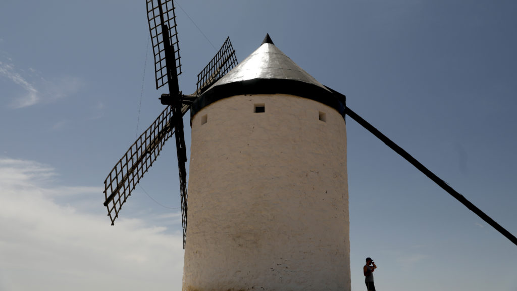 Un turista se refugia a la sombra de un molino de viento durante la ola de calor de esta semana. Foto: Susana Vera / Reuters