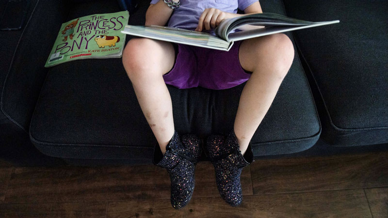 Keegan lee en su casa. Su libro favorito es «Prince + The Dressmaker». Sus padres también han incluido la literatura infantil LGBTQ en su lista de lectura. El objetivo, dicen, es enseñarle la historia relacionada con LGBTQ para que pueda comprender mejor lo que otros pasaron y, a su vez, apreciar su derecho a hacer determinadas cosas como usar vestidos. Frecuentemente revisan el libro «Orgullo: Celebrando la diversidad y la comunidad» de Robin Stevenson, de la biblioteca local, que incluye la historia de Stonewall. REUTERS / Amanda Voisard