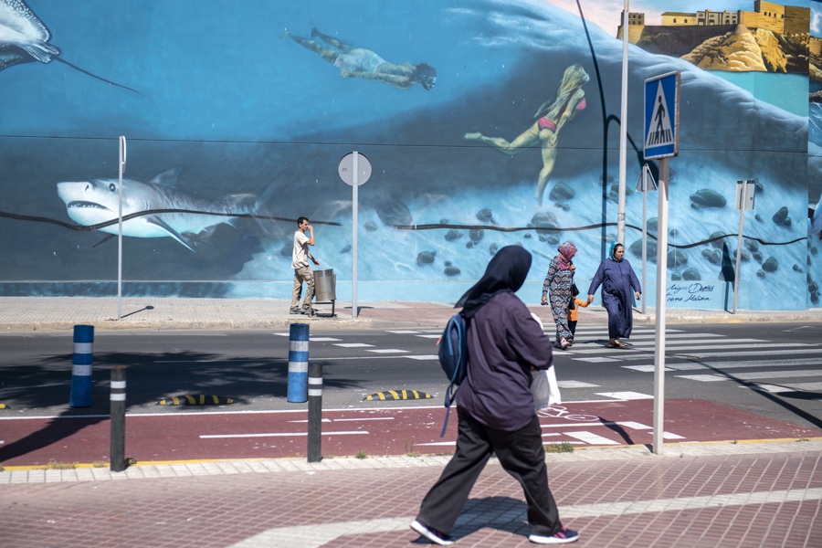 Noor viste shilaba y velo por imperativo de su marido. Como licencia estética, calza zapatillas deportivas negras, su color favorito también para la túnica que le llega a los pies. El colorido lo limita al pañuelo que cubre sus cabellos. Las gafas de sol redondas de estilo bohemio complementan el look de esta joven risueña que estudió hasta los diecisiete años, cuando se casó con un compañero de trabajo de su padre, ambos dedicados a cruzar la frontera con mercancía a cuestas en el llamado comercio atípico. Este contrabando legalizado es posible gracias a una excepción acordada entre el gobierno marroquí y el español para los Acuerdos de Schengen –firmados en los 90– que autoriza a los habitantes de Melilla y de la región de Nador a transportar aquello que puedan cargar físicamente, con el fin de dar un respiro económico a la región, y subsidiariamente, de crear una pantalla para el lavado de dinero negro.
