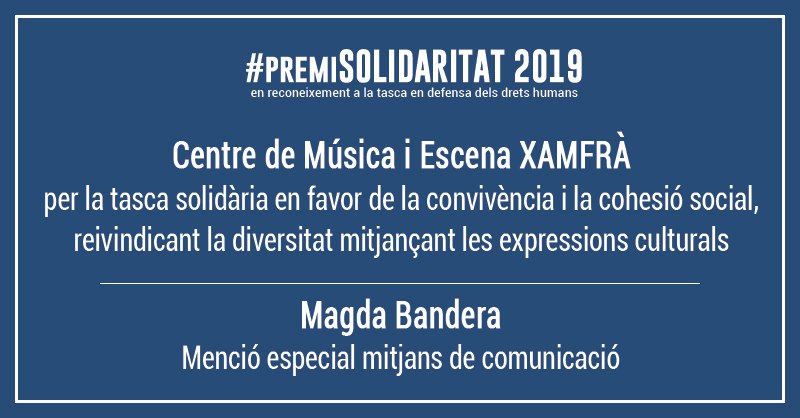 El premio Solidaritat 2019, que el IDHC concede desde 1987, ha recaído en el Centre de Música i Escena del Raval Xamfrà por la labor que desarrolla a favor «de la convivencia y la cohesión social, reivindicando el valor de la diversidad mediante las expresiones culturales».