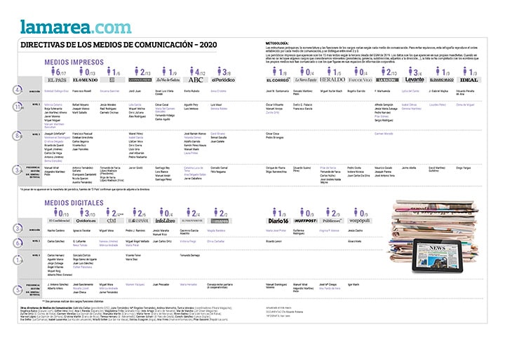 En junio de 2018 se produjo un hito importante: Soledad Gallego-Díaz fue nombrada directora de El País. Una mujer pasó a dirigir uno de los medios de ámbito estatal más influyentes. Hasta entonces, de los 15 periódicos en papel más leídos según el EGM, tan solo dos estaban dirigidos por mujeres: Encarna Samitier, al frente de 20 minutos, y Ángeles Rivero, en La Nueva España. En el apartado digital, de los 11 medios analizados, solo cuatro tenían a una periodista como directora: Magda Bandera, de La Marea; María José Pinto, de Diario16; Montserrat Domínguez, de HuffPost; y Ana Pardo de Vera y Virginia P. Alonso, de Público.