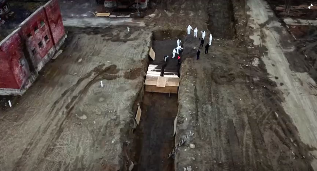 La agencia de noticias Reuters ha conseguido grabar con un dron cómo se están enterrando personas muertas por la COVID-19 en una fosa común abierta en una isla de Nueva York. La imagen de una docena de hombres introduciendo ataúdes en la zanja bien podría convertirse en el paradigma de la puntilla final que ha supuesto para la primera potencial mundial este virus. Nueva York, la sede de Wall Street, del sueño americano, del neoliberalismo más feroz, tiene que enterrar a sus difuntos aceleradamente en un hoyo, sin familiares ni testigos. La prensa tiene que recurrir a drones para documentarlo. Sus familiares asimilar que no les han podido despedir.