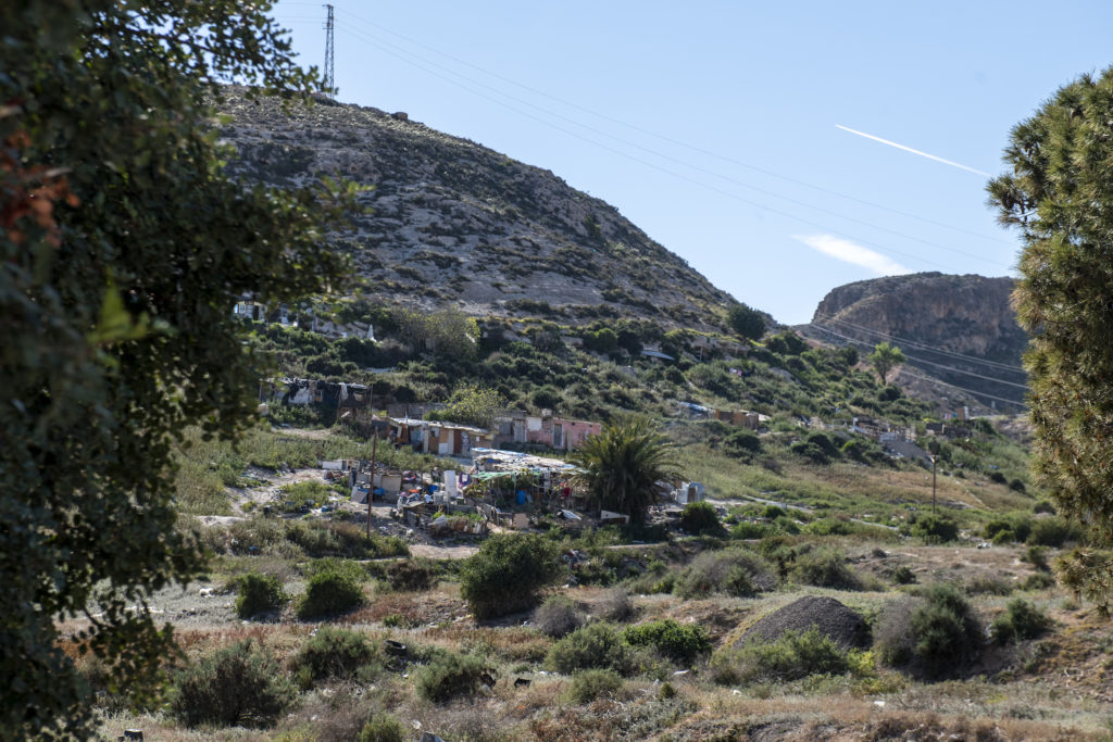 Mientras se sube desde Puerta de Purchena, el corazón de Almería, hasta las Cuevas de Marín, a apenas 20 minutos a pie, el aspecto de las calles se va transformando a ojos vista. Al llegar al monte, una decena de casetas unidas entre sí por los enganches ilegales de la luz acogen a familias sin apenas contacto con el exterior. De los elegantes edificios históricos del centro de Almería, de los bares y plazas llenos de gente (al filo del inicio de la alarma por coronavirus que llegaría solo unos días después), se va pasando a un paisaje más sobrio y aceras cada vez más estrechas cuando se avanza hasta a la plaza del Quemadero, a mitad de camino.
