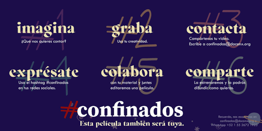 Bajo la premisa de que las consecuencias de esta crisis afectan a todos, pero no por igual, surge #Confinados, un proyecto que pretende, precisamente, ser el altavoz de las tantas vivencias que ocurren estos días. La idea, puesta en marcha por la cooperativa audiovisual Muzungu y los festivales de documentales DocsMX y DocsValencia, es recoger vídeos para realizar un documental de creación colectiva y sin ánimo de lucro. Por eso, cualquier persona puede grabarse y participar –los vídeos pueden enviarse hasta el 30 de abril–. De hecho, uno de las características que destacan desde el proyecto es la mirada global y un enfoque centrado en la defensa de los derechos humanos. El resultado final se estrenará en línea y será distribuido gratuitamente con una licencia Creative Commons.