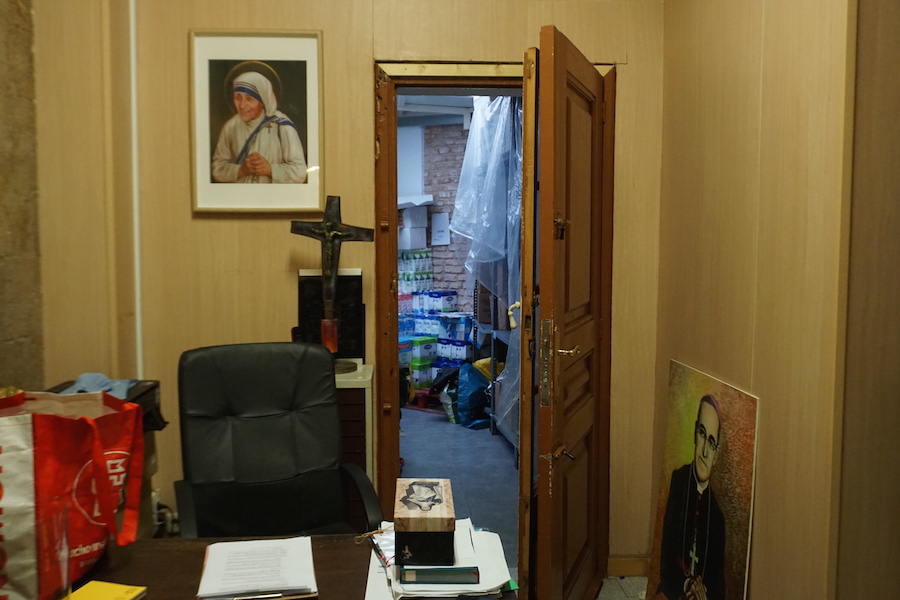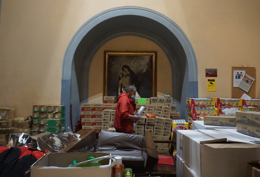 El padre Peio Sánchez atraviesa la sacristía de su parroquia. Vírgenes y cristos observan desde los frescos y esculturas la sala atestada de pilas de cajas de alimentos. El ambiente es fresco entre los muros de piedra del santuario románico-gótico. En un rincón, varios bancos destinados al rezo hacen ahora las veces de camastros para la docena de hombres que sigue pernoctando aquí, incluido el párroco. Jóvenes esquivan la mercancía para ir a rellenar una y otra vez los termos con café caliente: con leche, solo, con azúcar, sin ella. Un ritmo frenético de voluntarios en religiosa armonía.