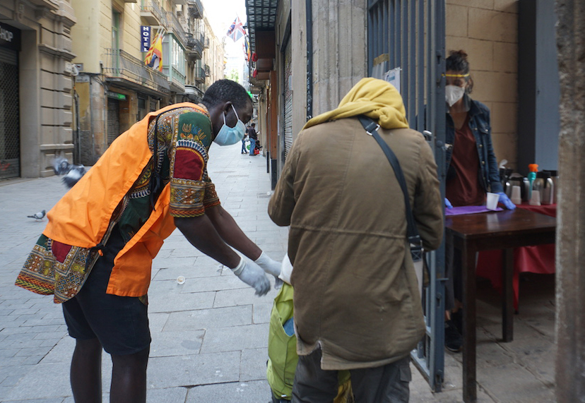 Por delante y por detrás de él, decenas de personas esperan su turno para recoger comida, un café caliente, ropa interior y mascarillas. A apenas unos minutos de las Ramblas, en una de las ciudades más ricas del mundo. Como él, miles de personas hacen cola para calmar el hambre en la capital de Catalunya gracias al trabajo humanitario que están haciendo decenas de entidades sociales y voluntarios.