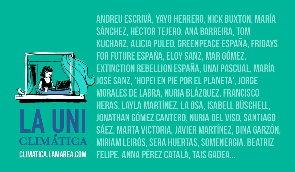 - ¿Quién? La lista de ponentes que participarán en La Uni Climática son: Andreu Escrivà, Yayo Herrero, Nick Buxton, María Sánchez, Héctor Tejero, Ana Barreira, Tom Kucharz, Alicia Puleo, Greenpeace España, Fridays For Future España, Eloy Sanz, Mar Gómez, Extinction Rebellion España, Unai Pascual, María José Sanz, ‘Hope! En pie por el planeta’, Jorge Morales de Labra, Nuria Blázquez, Francisco Heras, Alberto Arce, Layla Martínez, La Osa, Isabell Büschell, Jonathan Gómez Cantero, Nuria del Viso, Santiago Sáez, Marta Victoria, Javier Martínez, Dina Garzón, Miriam Leirós de Fridays For Future, Sera Huertas, SomEnergia, Beatriz Felipe, Anna Pérez Català y Tais Gadea Lara.