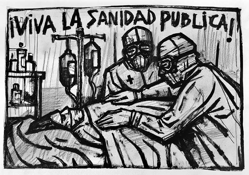 Por eso nos movemos en dos direcciones. Por un lado, queremos ser un espacio de reflexión y generar este debate y llevarlo hasta donde podamos, pidiendo colaboración a la gente implicada en esto; y, por otro lado, situarnos en una primera línea de defensa de lo público cuando llega. Ahora ha llegado por los Sanitarios Necesarios, que ahora se van a ir a la calle, y tenemos que estar ahí haciendo carteles para reivindicar su lucha, hacer proyecciones en las fachadas de los hospitales… Tenemos que tener también ese componente de acción y bajar al barro y mojarnos.