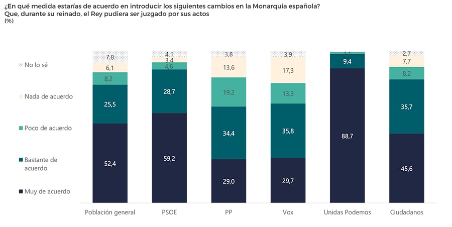 Más allá de las diferencias entre votantes de los diferentes partidos, más allá de las diferencias entre comunidades y más allá de las diferencias entre las distintas edades, una abrumadora mayoría considera que la monarquía no puede seguir como hasta ahora. Es decir, necesita cambios tan sustanciales como acabar con la inviolabilidad del rey, eliminar de la Constitución el artículo machista que da prioridad al hombre frente a la mujer en la sucesión a la Corona y mejorar la transparencia en las cuentas y patrimonio de la familia real.