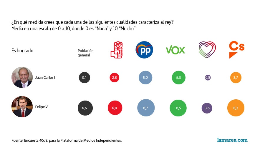 La encuesta, dirigida por la expresidenta del CIS Belén Barreiro, evalúa además, por primera vez, el papel del rey emérito tras los últimos escándalos sobre sus negocios y al rey Felipe desde que es rey. Al primero, a quien se le reconoce su papel en la Transición y su renuncia al trono, la ciudadanía lo suspende con un 3,3. Los escándalos financieros y su marcha a Arabia Saudí han dinamitado su imagen. Al segundo, de quien un 48% de las personas encuestadas considera que conocía los negocios de su padre y un 41% que se benefició de ellos, le otorgan en general un 5,8. Ni siquiera la reacción ante la huida de su padre –calificada con un 5 raspado–, les merece un suspenso.