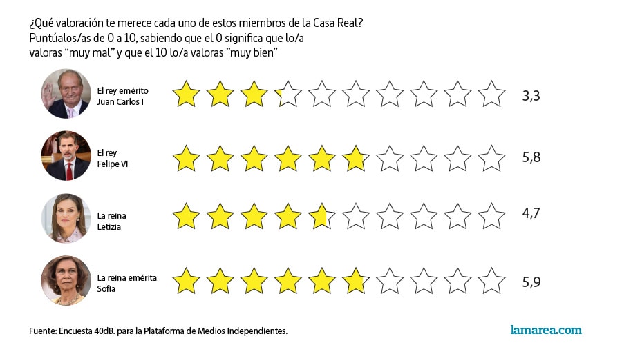 Impulsada por 16 medios independientes*, entre ellos La Marea, estos son algunos de los principales datos obtenidos en la encuesta sobre la monarquía realizada por el instituto demoscópico 40dB. después de constatar que el Centro de Investigaciones Sociológicas (CIS) descarta preguntar al respecto. Según argumentó el pasado septiembre su presidente, José Félix Tezanos, esta cuestión «ni interesa ni preocupa». El PSOE, incluso, rechazó una propuesta de Unidas Podemos en la que se pedía que el CIS, un organismo público que pagamos todos, realizara el sondeo.