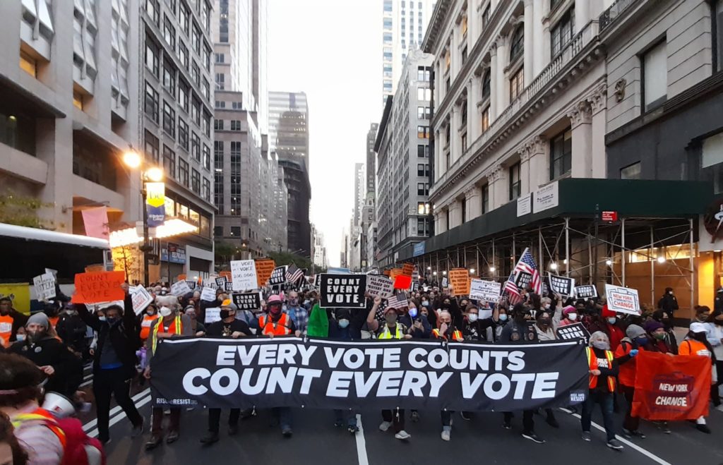 Nick MacDonalds avanza serio por la Quinta Avenida. Nunca se imaginó que su país «pudiese estar tan cerca del fascismo, de perder la democracia por un presidente que está dispuesto a dar un golpe de Estado”, explica rodeado de las miles de personas que ayer congregó en la ciudad de Nueva York la manifestación convocada por el movimiento #EveryVoteCounts (Cada voto cuenta, en español). El país que ha invadido y arrasado otros países en nombre de la paz y la democracia ve ahora cómo se llenan las calles de sus ciudades para exigir que se contabilicen todos los votos que decidirán quién será el futuro presidente.