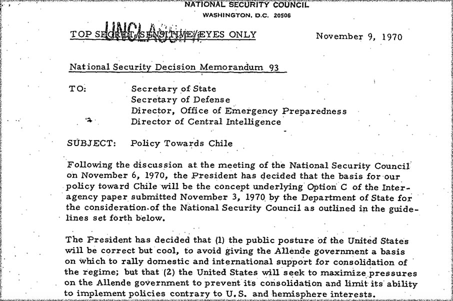 En los días posteriores al 4 de noviembre de 1970, día de la victoria de la coalición izquierdista Unidad Popular en las elecciones chilenas, Nixon reunió a su Consejo de Seguridad Nacional para evaluar la situación. Según un informe de Kissinger, que ha visto la luz 50 años después, el gobierno de Salvador Allende era para Estados Unidos “uno de los desafíos más graves encarados nunca” en el continente americano. La Casa Blanca temía que aquella victoria socialista se replicara en otros países latinoamericanos y planeó la mejor forma de evitarlo. “Nos mostraremos muy tranquilos y muy correctos, pero las cosas que hagamos deben ser un mensaje muy claro para Allende y para otros”, dijo Nixon ante el Consejo de Seguridad.