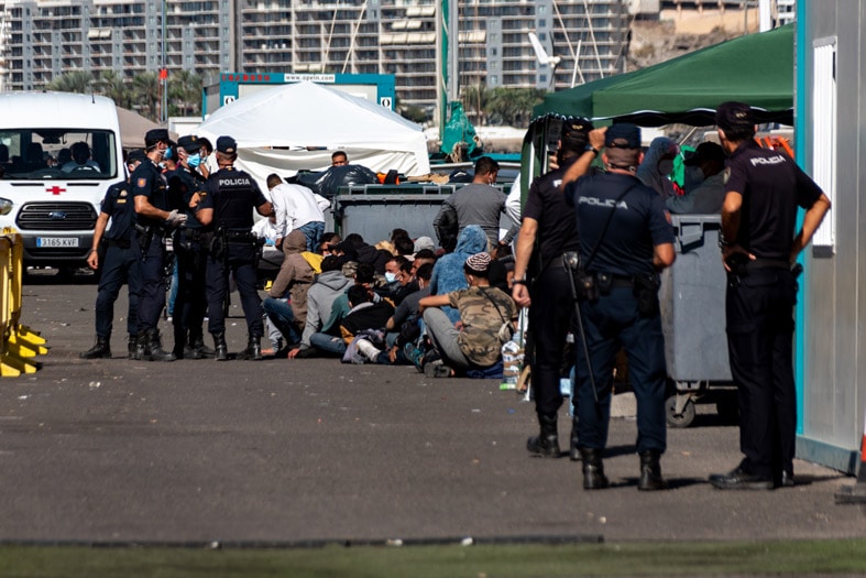 Suena la voz de una mujer joven por la radio de uno de los agentes de policía que está custodiando la entrada: «Con la nueva patera que ha llegado no tenemos espacio físico en el muelle», reconoce. Este martes, el muelle del puerto de Arguineguín, en Gran Canaria, alberga ya a 2.600 personas. El campamento levantado a principios de agosto iba a ser temporal. Ahora, es la mayor prueba de una política migratoria fallida por parte de España y Europa.