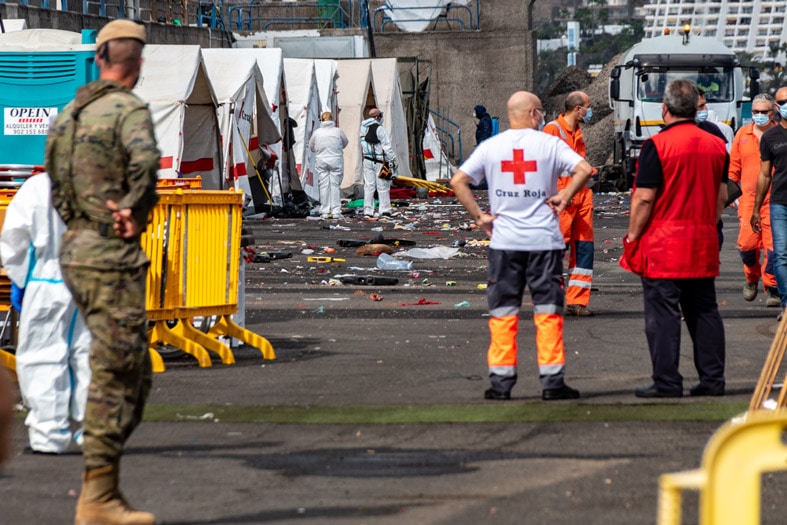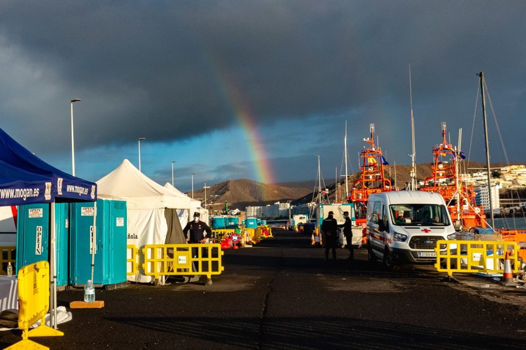 Este lunes, el muelle amanecía tranquilo, lejos de la tónica habitual de las últimas semanas. Desde primera hora, comenzaron las labores de limpieza y desinfección, paso previo al desmantelamiento de las carpas. Desde Cruz Roja han pedido que se no se quiten todas estas para atender correctamente a las personas que lleguen a Arguineguín, que seguirá sirviendo como puerto de recepción de las pateras y cayucos interceptados por Salvamento Marítimo. Sin embargo, el Ayuntamiento de Mogán ha pedido que hoy ya no quede ni rastro del campamento.