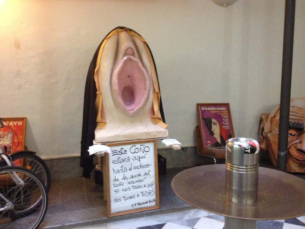 Ahora, en Málaga, han condenado a una activista feminista por lanzar un mensaje crítico mediante la burla de una tradición tan arraigada y respetable como las procesiones de Semana Santa, pero no hasta el extremo de coartar su libertad de expresión y ser condenada por ello. El juez que dicta la sentencia cree que adorar jocosamente a un coño como si fuera una virgen, pasearlo y rezarle es algo prohibido por la ley, porque los católicos pueden sentirse ofendidos al verlo. Pero tras esta argumentación se esconde la idea de que los dogmas de la religión no vinculan solamente a quienes creen en ellos sino que deben ser respetados de alguna manera por toda la sociedad. En definitiva, castiga la blasfemia.