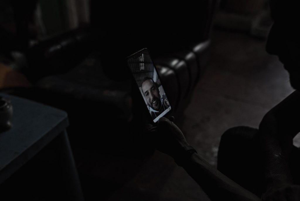 Mohamed Bouhafra en el salón de su casa mientras habla por videollamada con Abdrahim Achour, superviviente del naufragio de la patera en Órzola. Foto: Eduardo Robaina.