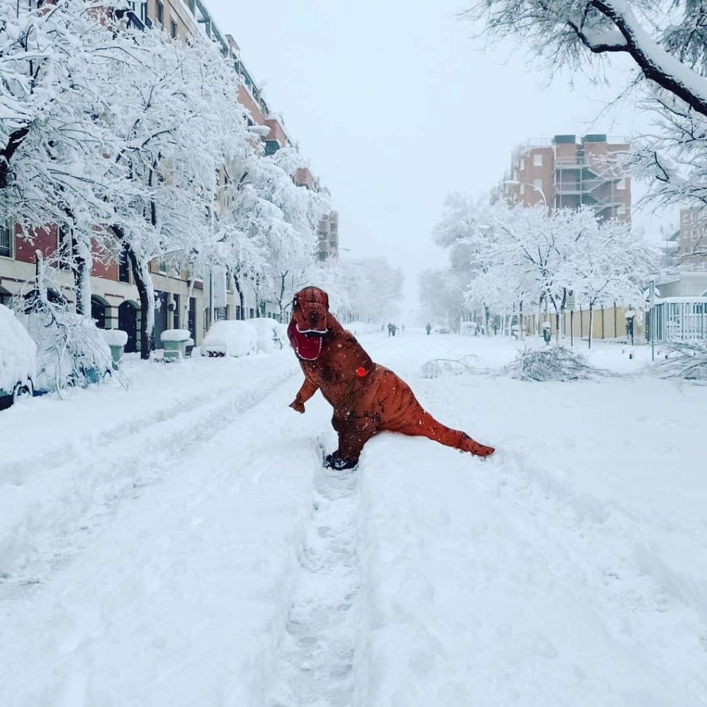 Una persona disfrazada de dinosaurio en la nieve, en Madrid. JURASSIC TRAVELS / REUTERS