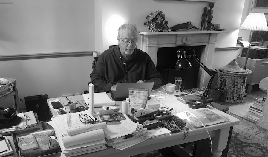Sentado en el escritorio en el que desde que comenzó la pandemia comienza a escribir a las cuatro y media de la mañana, despliega desde el saludo inicial la ingrávida naturalidad en el trato de quien ha aprendido desde la cuna a relacionarse con personas de distinto origen y clase social, la ágil calidez de quienes hacen sentir al interlocutor un inteligente viejo conocido, y la cada vez más rara deferencia de reflexionar antes de contestar cada respuesta.