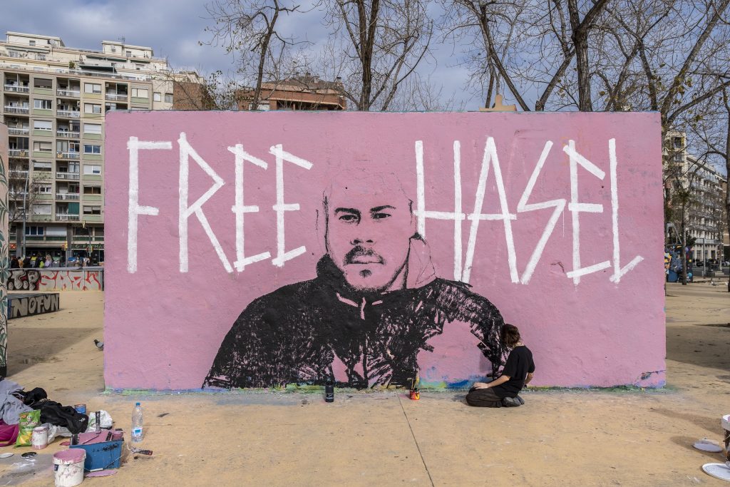 Un artista pinta un graffiti que pide la libertad del rapero Pablo Hasel. PACO FREIRE / REUTERS