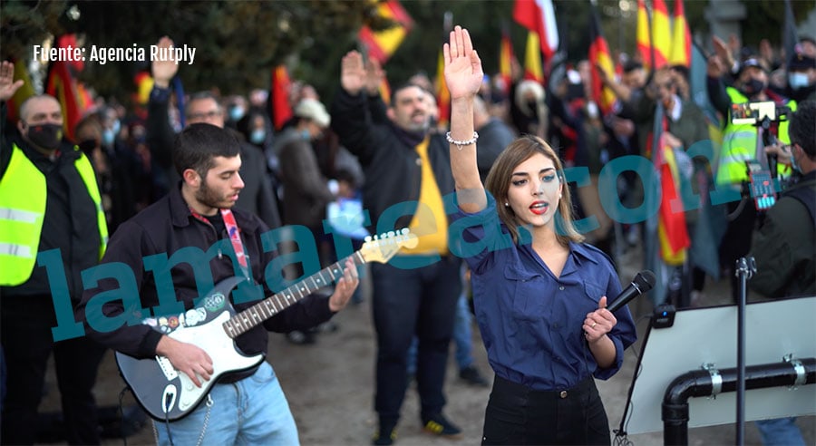 Otro de los oradores fue Ignacio Menéndez, abogado del ultraderechista Carlos García Juliá –coautor de los asesinatos de los abogados de Atocha en 1977, recientemente excarcelado–. Micrófono en mano, pidió a los asistentes no cumplir con las medidas sanitarias contra la COVID-19: “Hace falta que incumpláis el toque de queda, que os reunáis con vuestros familiares y amigos, que seáis más de seis como somos hoy aquí; y que os abracéis, y que cantéis y que viváis alegres. Porque el fascismo es alegría”.