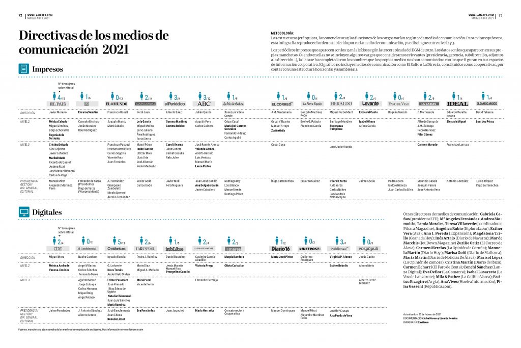 En 2020, de los 26 medios analizados, solo siete estaban dirigidos por una mujer: El País, 20 Minutos, El Periódico, Levante, La Marea, Diario 16 y Público. En el primer trimestre de 2021 esa cifra se ha reducido y son cinco los medios analizados que tienen a una mujer como directora: 20 Minutos, Levante, La Marea, Diario 16 y Público. En El País, Javier Moreno ha sustituido a Soledad Gállego-Díaz en los últimos meses y en El Periódico Alberto Sáez coge el relevo de Anna Cristeto, aunque tiene ahora a dos mujeres como directoras adjuntas: Gemma Martínez y Gemma Robles.