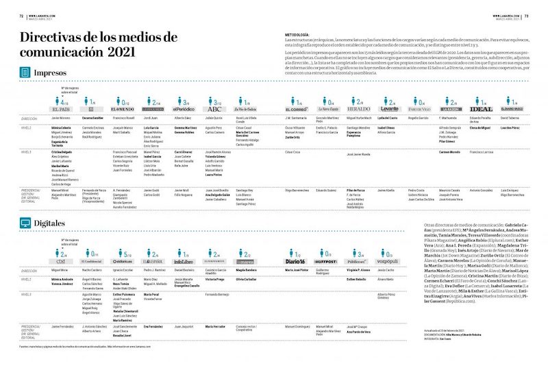 En 2020, de los 26 medios analizados, solo siete estaban dirigidos por una mujer: El País, 20 Minutos, El Periódico, Levante, La Marea, Diario 16 y Público. En el primer trimestre de 2021 esa cifra se ha reducido y son cinco los medios analizados que tienen a una mujer como directora: 20 Minutos, Levante, La Marea, Diario 16 y Público. En El País, Javier Moreno ha sustituido a Soledad Gállego-Díaz en los últimos meses y en El Periódico Alberto Sáez coge el relevo de Anna Cristeto, aunque tiene ahora a dos mujeres como directoras adjuntas: Gemma Martínez y Gemma Robles.