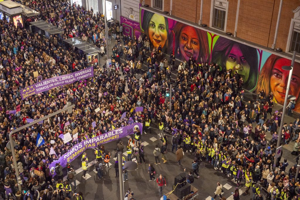 Panorámica de la manifestación del 8-M celebrada en Madrid en 2019. El segundo rostro que se ve pintado en el mural es el de Rafaela Pimentel, de Territorio Doméstico. ÁLVARO MINGUITO